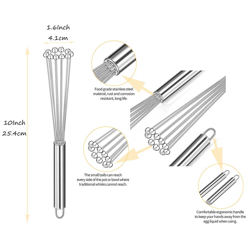 - Exquisite design: The whisk ball is equipped with 10 hard threads,The end has a ball design point,Flat whisk design takes up less space in your drawer and allows you to reach right to the edge of the pan or pot where traditional whisks cannot,The small balls can reach every side of the pot or bowl where traditional whisks cannot reach. which improves the efficiency of the mixing process and will bring you more convenience in the application and cleaning process, saving you time and energy.