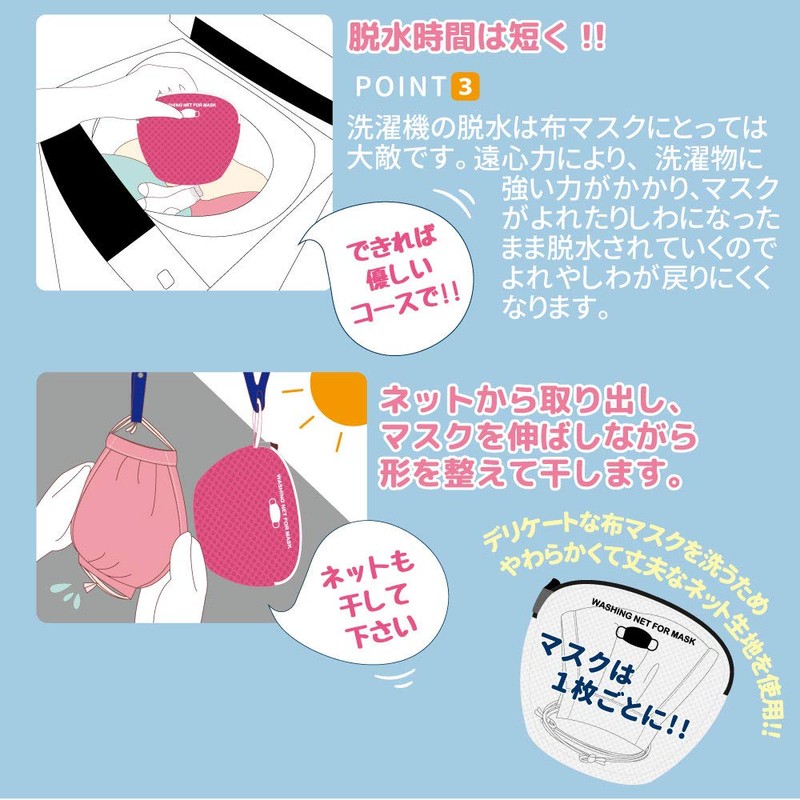 - 1. Fold it in half with the inside facing out that hits the skin. 2. Insert a mask in accordance with the shape of the net. 3. Dehydration time is short. 4. Remove from the net, stretch the mask and adjust the shape. Please dry the net together