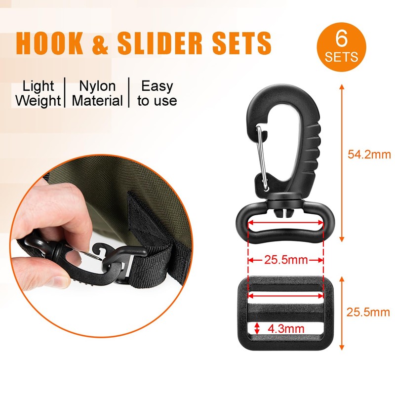 1" Plastic Clip Snap Hook Replacement Buckles Tri-Glide for Webbing Strap Crafting Accessories 6 Set (Hooks & Adjustable Buckle)