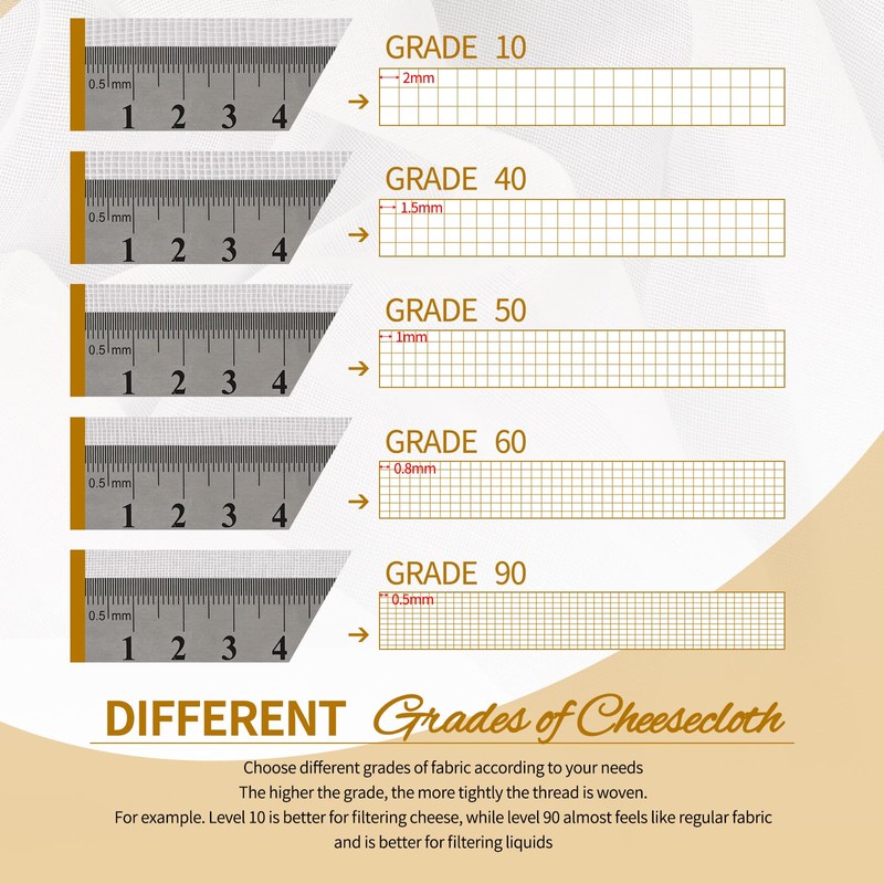 The higher the grade, the more tightly the thread is woven. Level 10 is better for filtering cheese, while level 90 almost feels like regular fabric and is better for filtering liquids