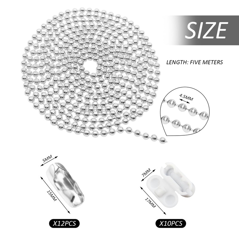 • Product content: You will receive a set of roller blind accessories, including a 5-meter-long, 4.5mm-thick white chain, 12 metal white k-color bead buttons, and 10 white bead buttons.