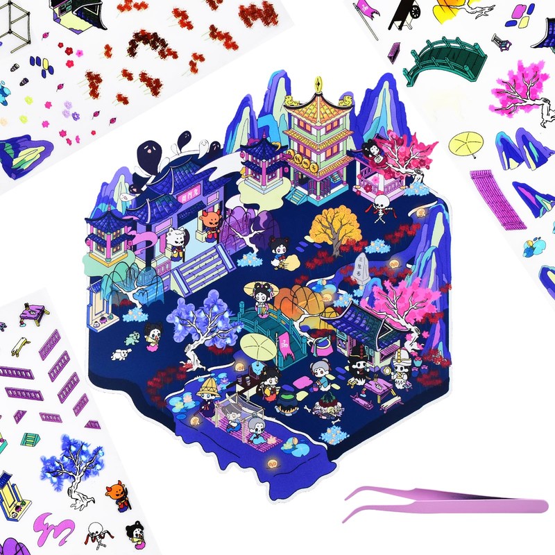 1 Sets Large 3D Sticker Scene 3D House Stickers with Tweezers Ancient Style Restaurant Scenes Make Your Own House Miniature Scene Stickers