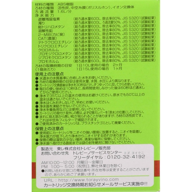 • Water Purification Capacity: Free Residual Chlorine, Total Trihalomethane, Soluble Lead, 2-MIB (Musty Odor), CAT (Pesticide), Tetrachloroethylene, Trichloroethane, Chloroformm, Bromodichloromethane, Divromomethane, Bromoform: Total Filtration Flow Rate 600L (80%) Filtration Flow Rate: 50 %)