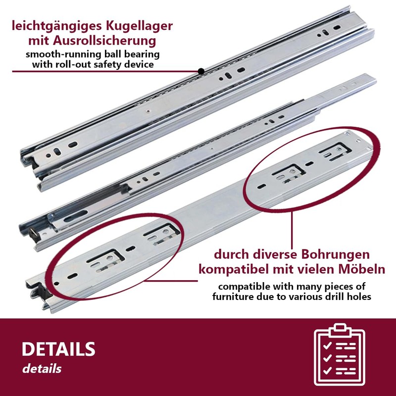 1 x Pair of Runners for Drawers – Smooth and Precise Drawers Made of Steel – Full Extension, Various Sizes