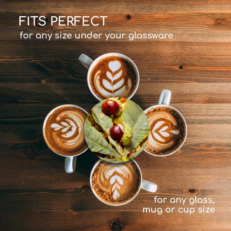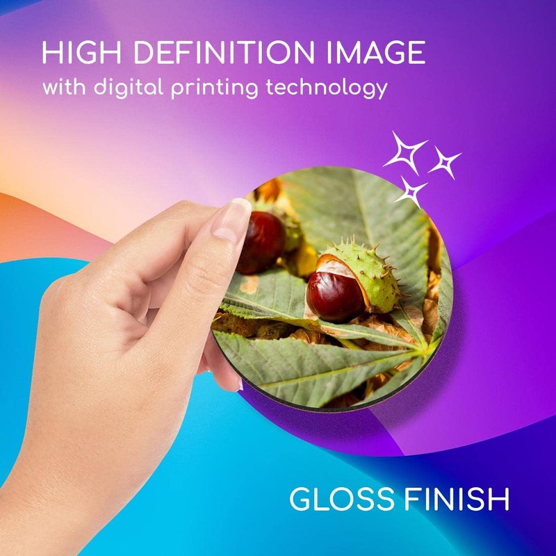 - Strong MDF Wood - The coaster upper layer is a glossy printed image, the middle layer is MDF wood, with a natural cork base to protect your dining table or office desk.