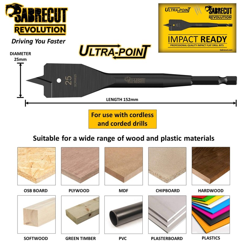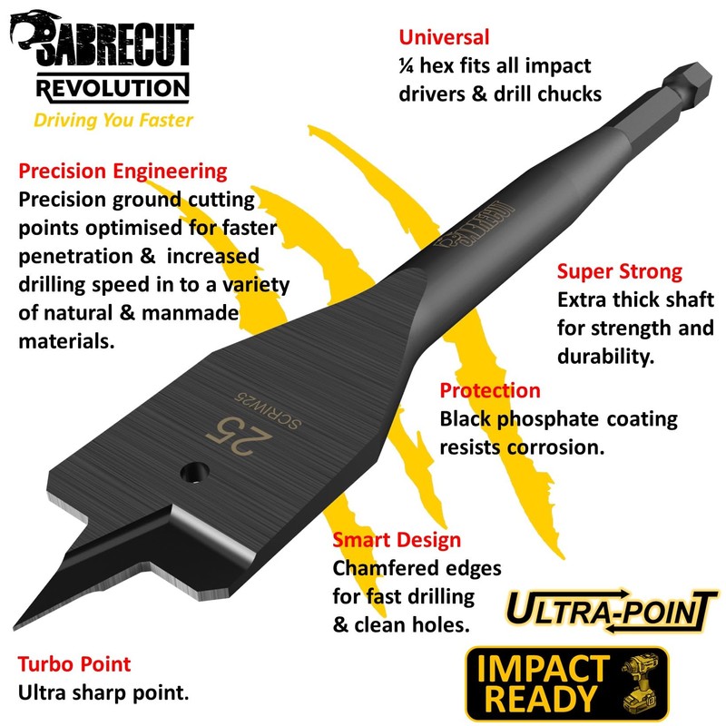 SabreCut Revolution Impact rated spade bits features a extra thick toughened shank designed for use in impact drivers, combi drills and drill drivers. Professional quality impact spade bits with a universal 1/4" hex. Can also be used in standard chucks for a secure non slip fit.