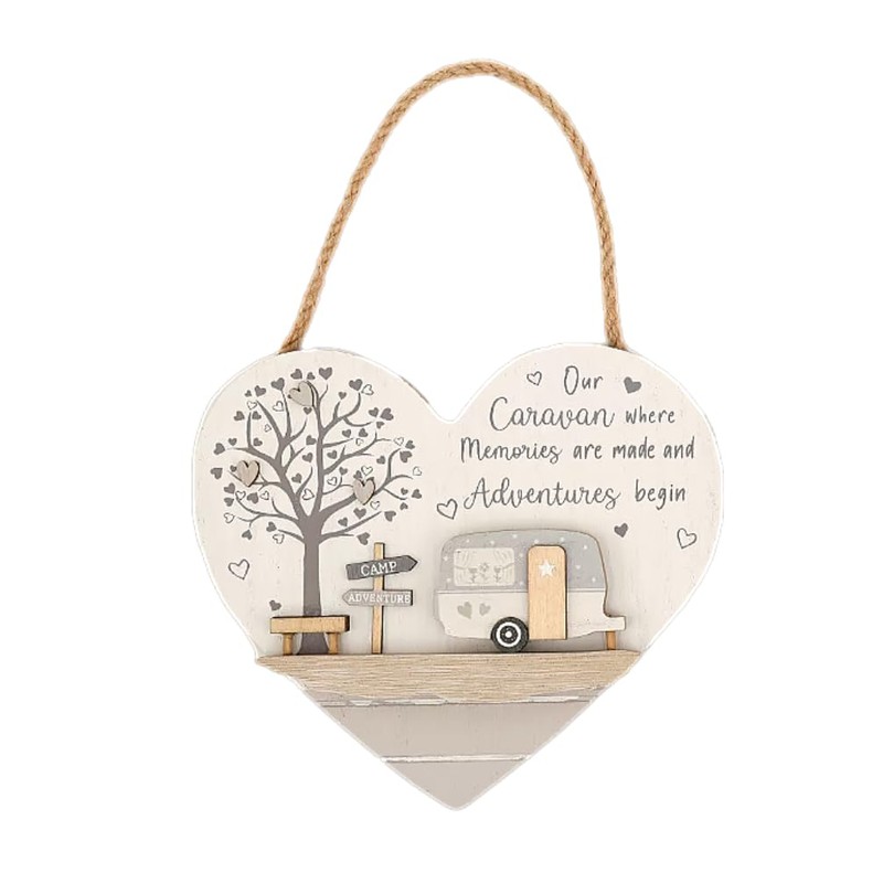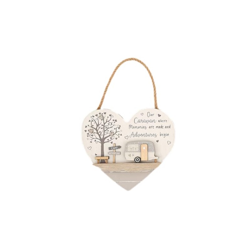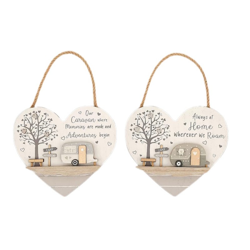 1 x Shabby Chic Heart Shaped 3D Wooden Caravan Holiday Hanging Decoration/Plaque - 2 Designs Shown - Cream, Brown, Grey, Natural - 16 cm - One Chosen At Random