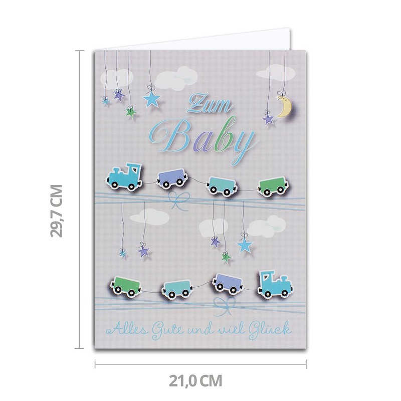 1 x XXL Baby Greetings Card for Birth DIN A4 – Large Baby Card – Set with Large Envelope DIN C4 – Toy Train – for Boys