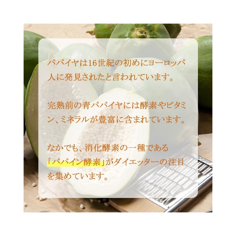 - 熱帯の植物である青パパイヤは酵素やビタミン、ミネラルが豊富で、沖縄の家庭では昔から食されてきました。さらに、青パパイヤに含まれる消化酵素の一種である「パパイン酵素」が注目を集めています。