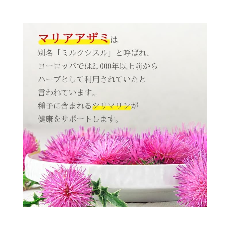 - お酒好きの方のサポート成分としてマリアアザミ+ウコンを配合!マリアアザミの種子に含まれる シリマリン (フラボノイド)とウコンに含まれる クルクミン が健康をサポートします。