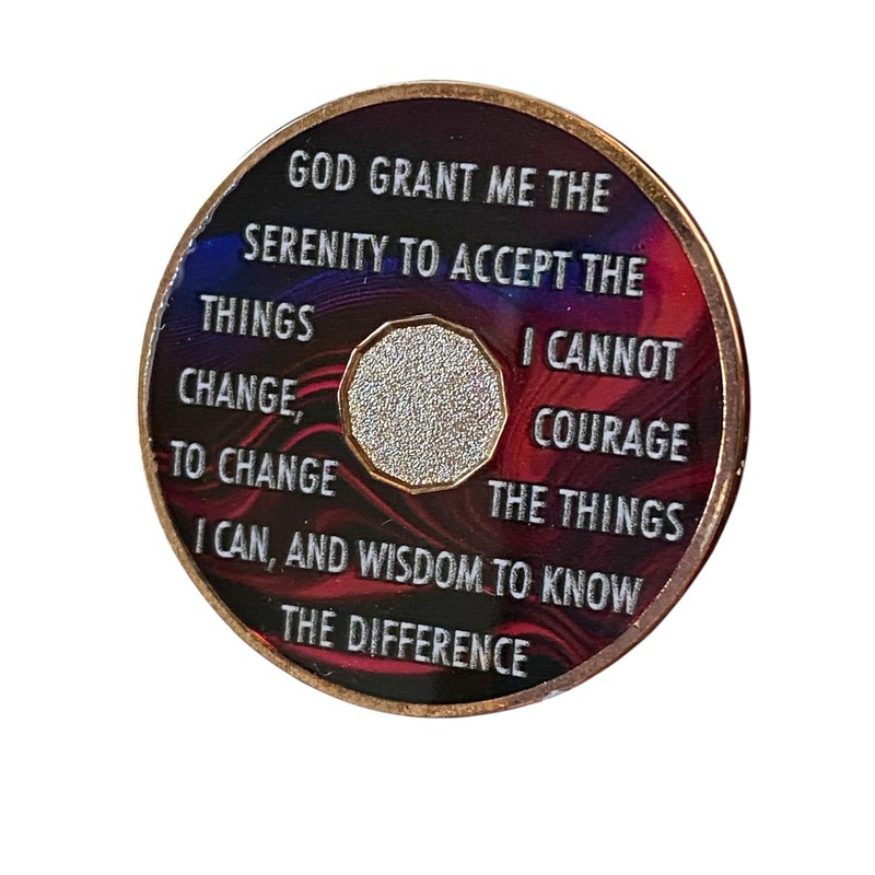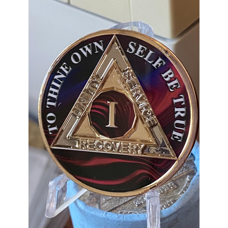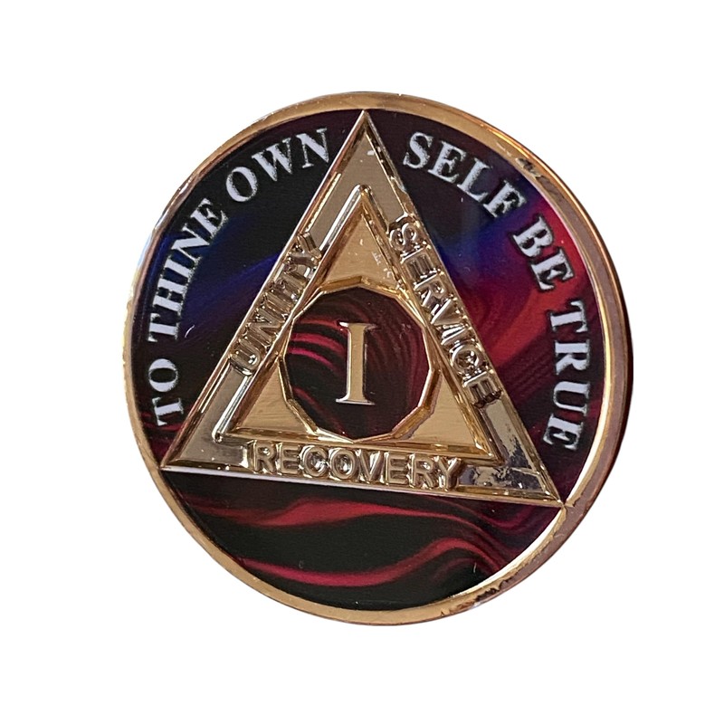 1 Year AA Medallion Purple Red Swirl Tri-Plate Sobriety Chip Serenity Prayer Back