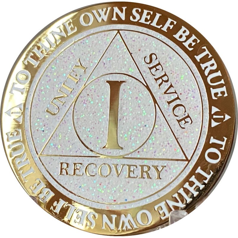 - 1 Year AA Sobriety Medallion In Reflex White Glitter & Gold Plated With Serenity Prayer On The Back