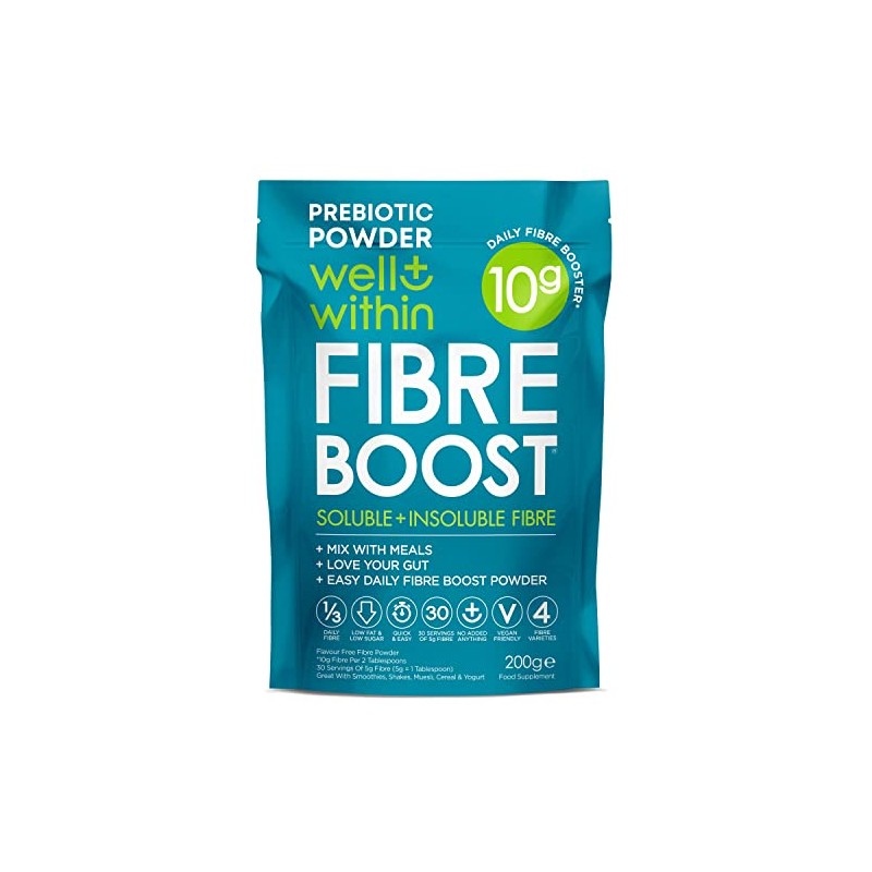 10,000mg Fibre Supplement Prebiotic Powder, 10 Gram Boost = 1/3 NHS Daily Fibre, 4 Types (200g Bag, 30 x 5g Fiber) Well Within Gut Health Supplements Soluble + Insoluble Fibre Powder Men, Women, Kids