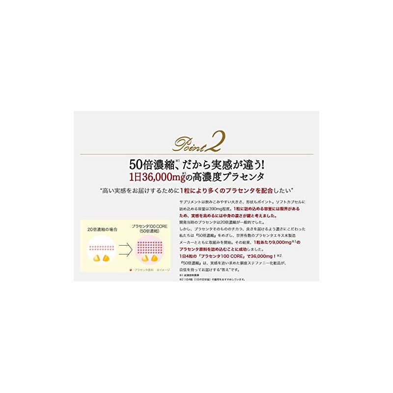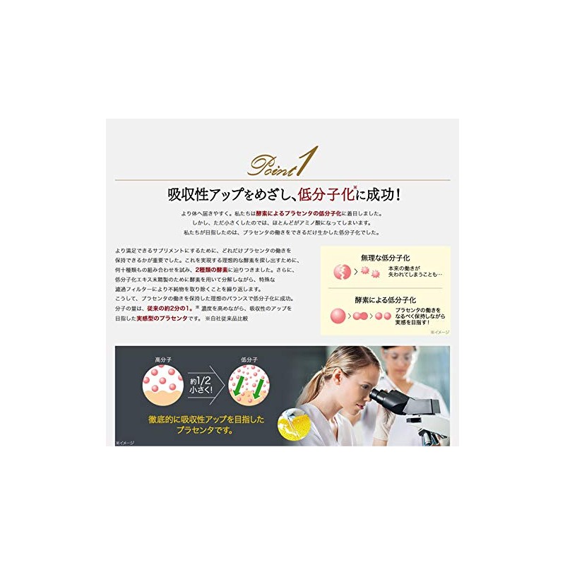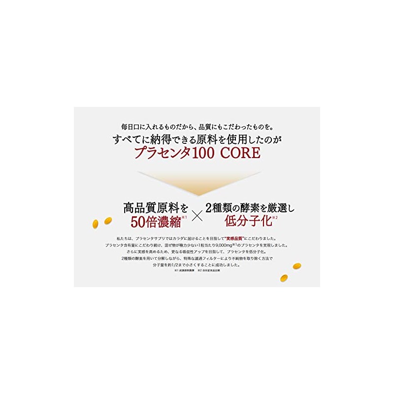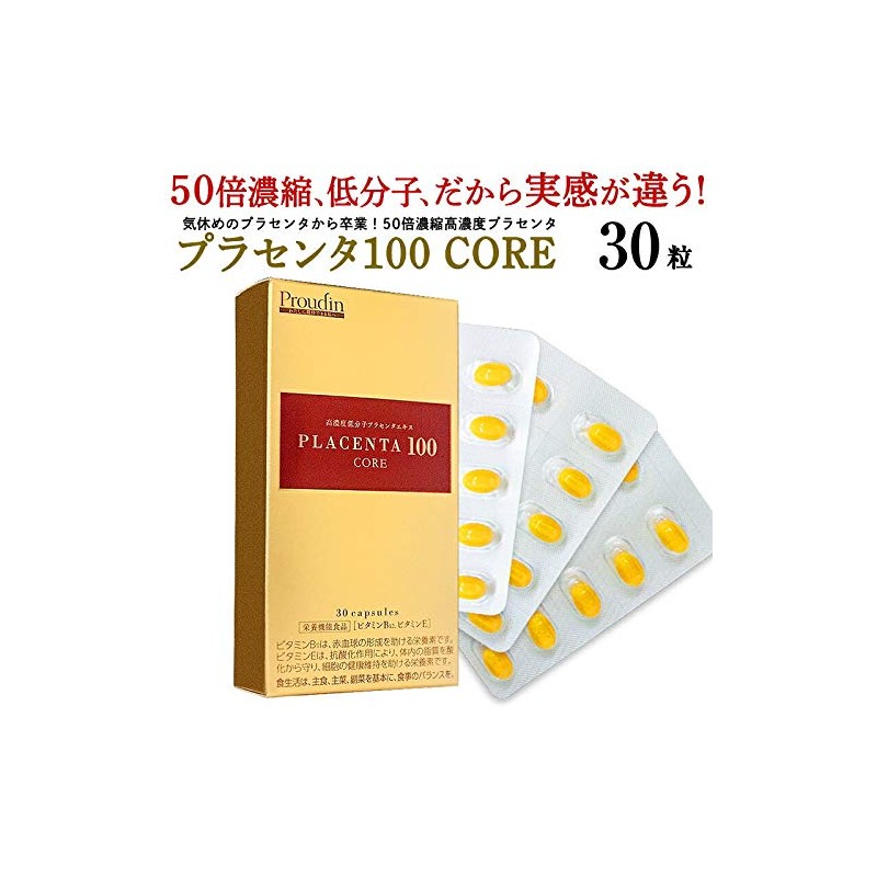 1箱30粒入りの3箱セットです。 大人気商品の「プラセンタ100」を低分子化しさらに吸収率アップ。 アミノ酸、ビタミンなど美容と健康に欠かせない栄養成分をバランス良く配合しました。 1粒に180mgのプラセンタエキス末を配合。(原料換算すると9000mgになります。)