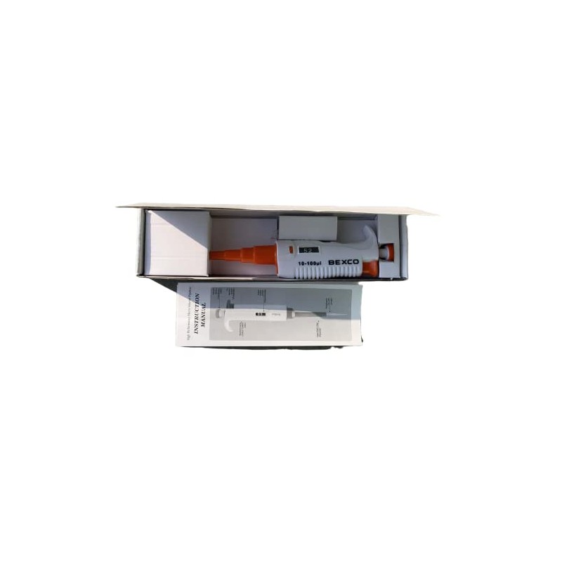 Variable Volume 10-100 Ul micropipette. With calibration certificate Easy volume setting by simply spinning the plunger. Clear Reading Window: Digital display clearly reads volume setting in increments of 1 μL Companionable with all major make of tips Autoclavable tip cone. (Partially Autoclavable)