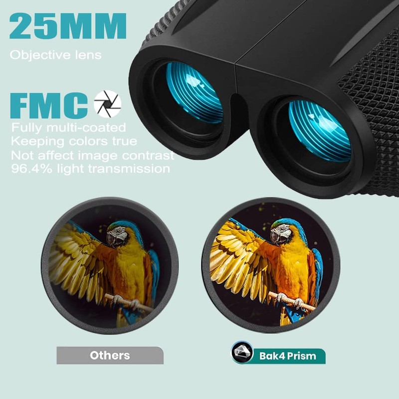 - 【25MM OBJECTIVE LENS PROVIDES LARGE FIELD OF VISION】: Equipped with 25mm large eyepiece, 10x25 binoculars provide more comfortable and larger field of vision. 273 feet/1000 yards wide field of vision, Coating with FMC Broadband coating and premium BAK4 principle, it ensure imaging verisimilar It is very suitable for opera, bird watching, camping, traveling, watching wildlife, football match, cruising or other outdoor activities.