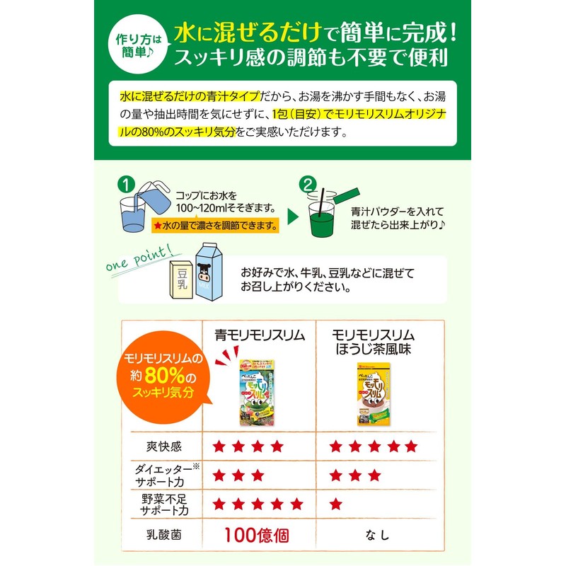- 「青モリモリスリム」は、発売から960万個(*)以上の実績を誇る、自然美容健康茶モリモリスリムの青汁バージョンです。新鮮な九州産の朝摘み大麦若葉をベースに、厳選した40種の野菜・フルーツ・ハーブを独自のバランスで配合。さらに、生きて腸まで届く乳酸菌もプラスして、「野菜不足」と「スッキリ気分」をWでサポートする、一石二鳥のおいしいフルーツ青汁です。野菜不足を補うために、そして、スッキリ爽快な気分のために、毎日飲んでも飽きのこないトロピカルフルーツ味の自然なおいしさをお楽しみください。 (*モリモリスリムシリーズ累計販売数(ほうじ茶、紅茶、コーヒー、ソフト、プレミアム、黒モリ、フレーバーティー)2024年4月末時点出荷実績 自社調べ。)