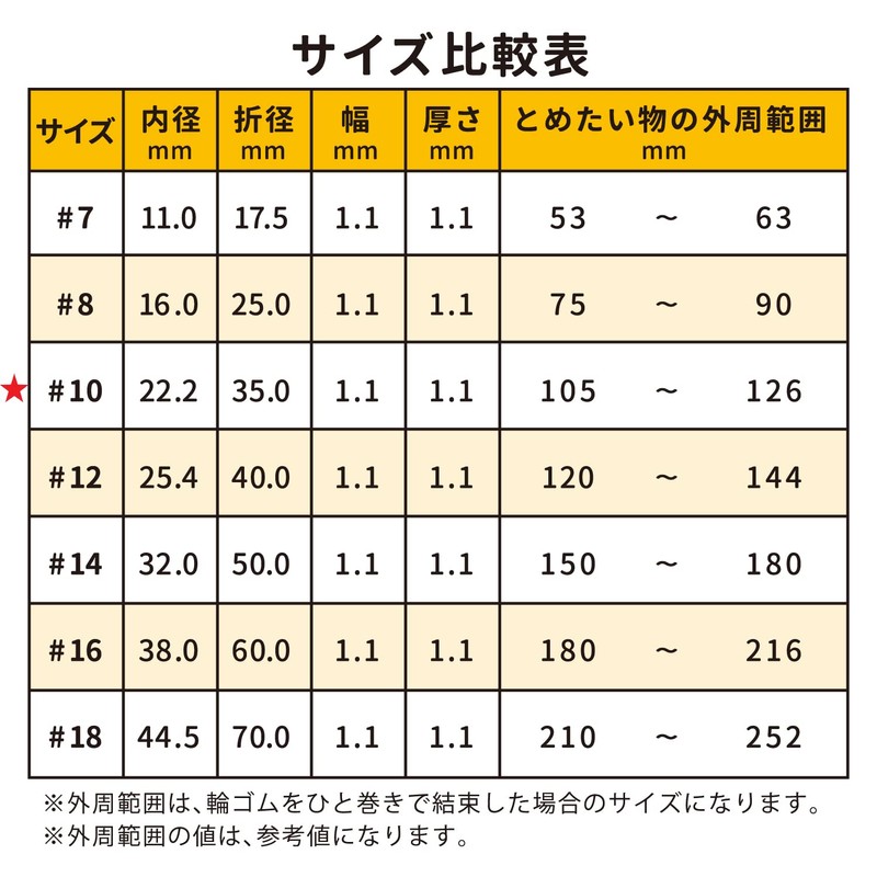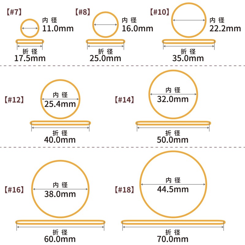 - #10 (#10): Inner diameter approx. 0.9 inches (22.2 mm), Folding diameter approx. 1.4 inches (35 mm), Cutting width approx. 0.04 inches (1.1 mm), Thickness approx. 0.04 inches (1.1 mm)