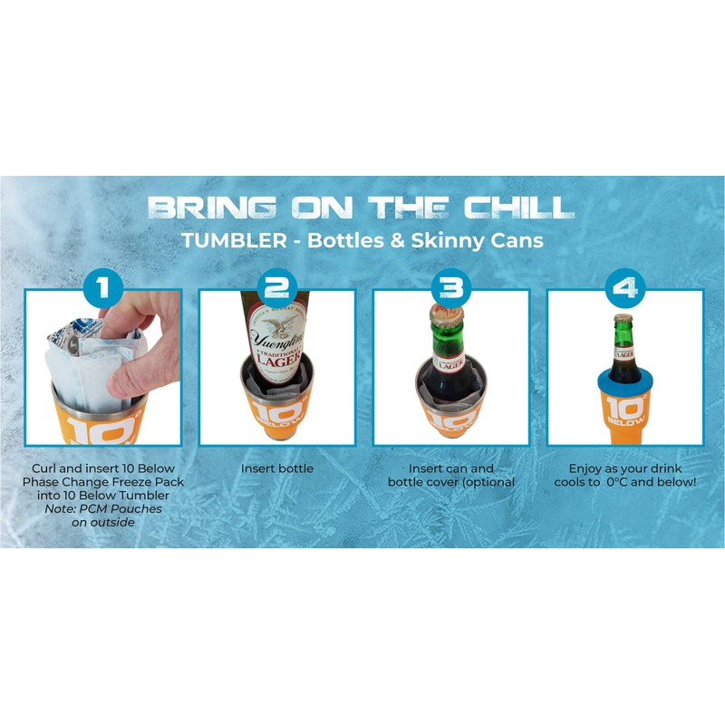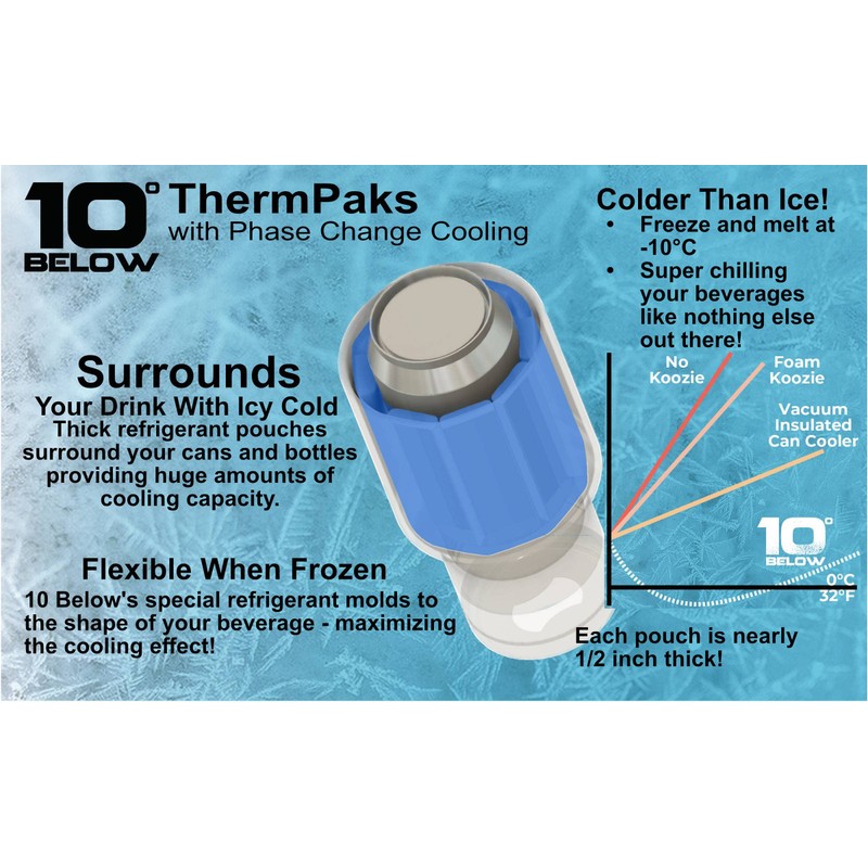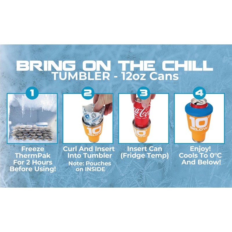 Upgrade your tumbler! Don't just insulate - the 10 Below chills cans and bottles to ZERO and BELOW! Our innovative cooling technology offers you lasting refreshment, ensuring that your last sip is colder than your first! Not only does it keep your drink frosty cold for hours, our revolutionary ThermPaks cool below -10C and chill your drink to 0C/32F and below!