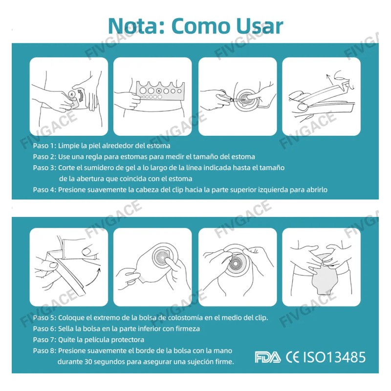 Incluye: sistema de cierre autoadhesivo de 30 unidades, tarjeta de medidas del estoma (admite una variedad de tamaños de 20 mm a 65 mm y se puede cortar libremente), pegatinas de cierre de orificios, guía de bienvenida y un amable servicio de atención al cliente.