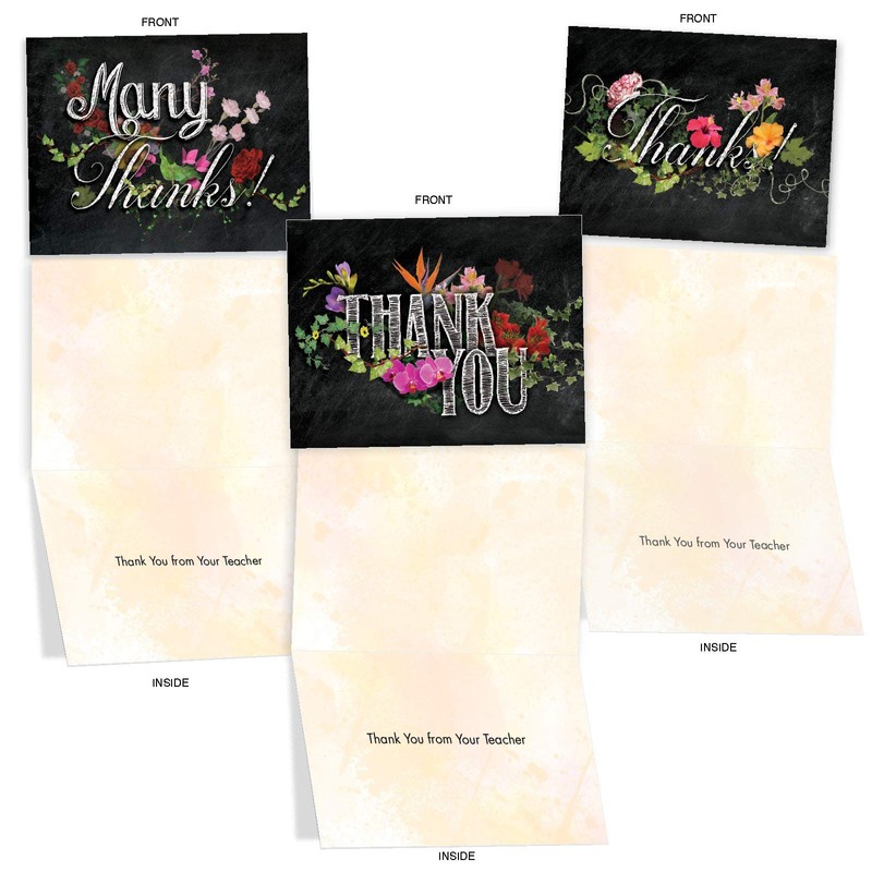 - 10 NOTE CARDS - Inside text: "Thank You From Your Teacher." If you're looking for a set of cute and cool thank you cards perfect for your students, then look no further! These cards feature a variety of real-life florals surrounding thank you messages in different fonts on black chalkboards. 'Chalk' it up to this designer for creating such delightful cards! Ships with envelopes and reusable box.