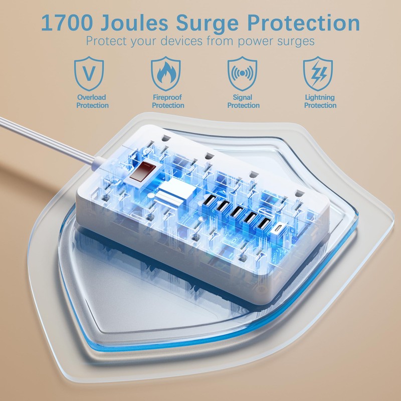 10 Ft Long Extension Cord,Power Strip Surge Protector HUNIAN Flat Plug with 8 Widely Spaced Outlets 6 USB(1 USB C Port), Wall Mount Charging Station for Home and Office,White
