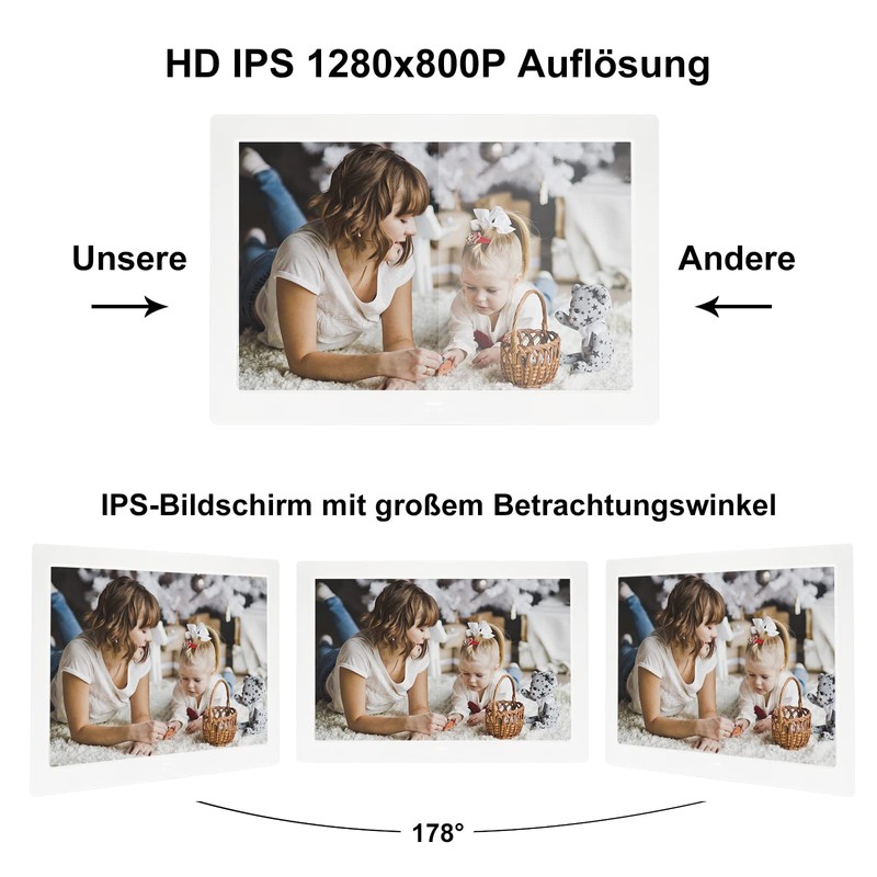 - ★ High-resolution screen: digital picture frame 10 inch with high-resolution 1280 x 800 IPS display (16:10) allows clear, rich and vibrant colour photos, the 175 degree IPS screen with wide viewing angle offers you the best viewing experience on both sides and sides