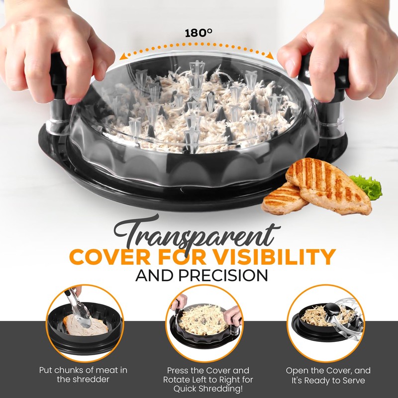 - 🔄 Easy-Grip Handle & Clear Lid – This shredded chicken tool Large ergonomic design for smooth twisting, with a clear lid to monitor texture.