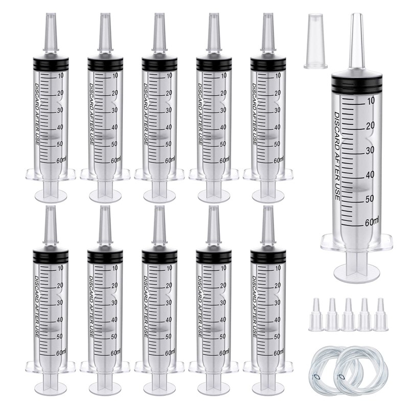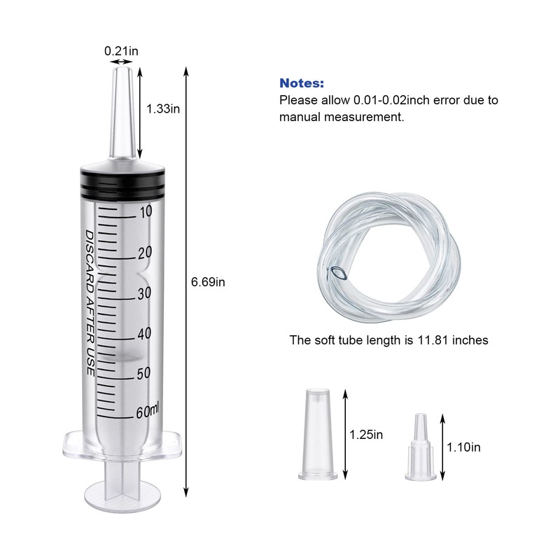 - ✿【Package Includes】: You will receive 10 pcs 60ml/cc plastic syringes, Each individually packaged syringe comes with a tip adapter. In addition, you will also receive 5 extra tip caps and 2 pcs 11.81inch(30cm) soft tube, enough for use or replacement.