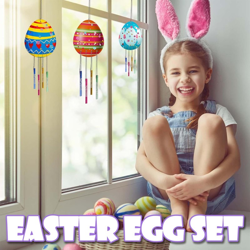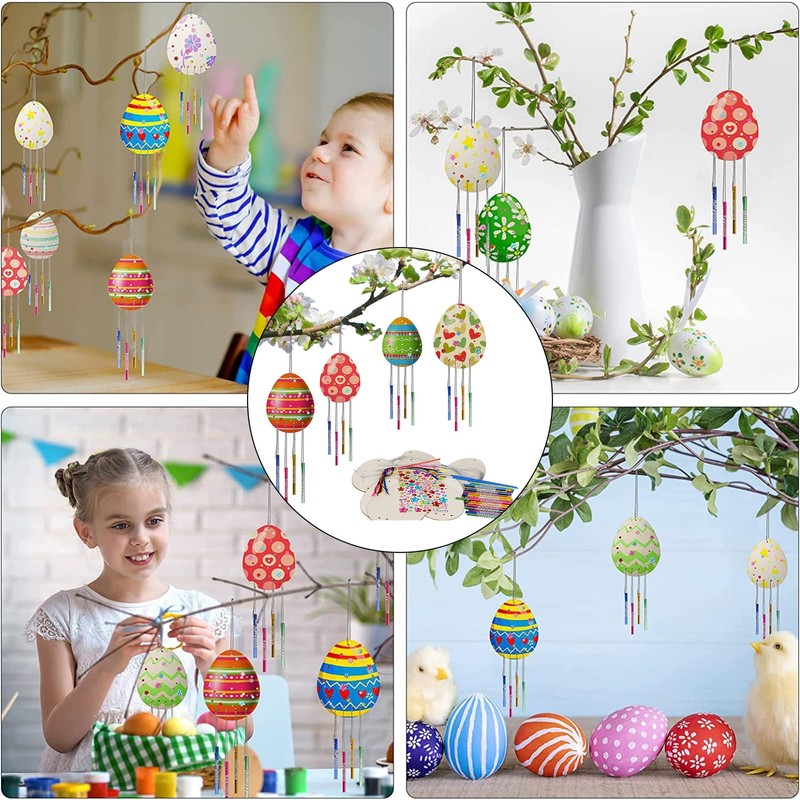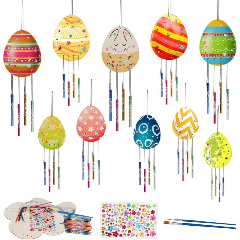 - Unique Easter Craft Kit: This Easter craft kit includes 10 wooden egg wind chime designs in two sizes, providing hours of fun and creativity. he kit comes with 5 large egg wood chips, 5 small egg wood chips, 40 colourful wind chime tubes,10m silver lines, 10 colorful ribbons, 2 painting brush, a sheet of self-adhesive rhinestone and instruction manual.