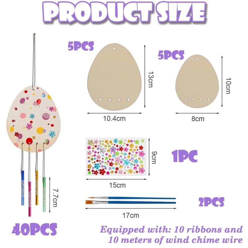- Set Includes: 10 Wooden Eggs (5 large, 5 small), 40 Colorful Wind Chime Tubes, 10m Silver Lines, 10 Colorful Ribbons, 2 Paintbrushes, Self-Adhesive Rhinestones, Instruction Manual.