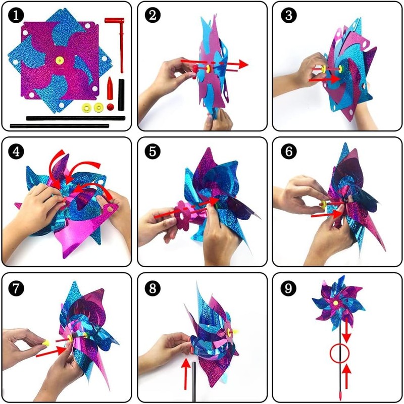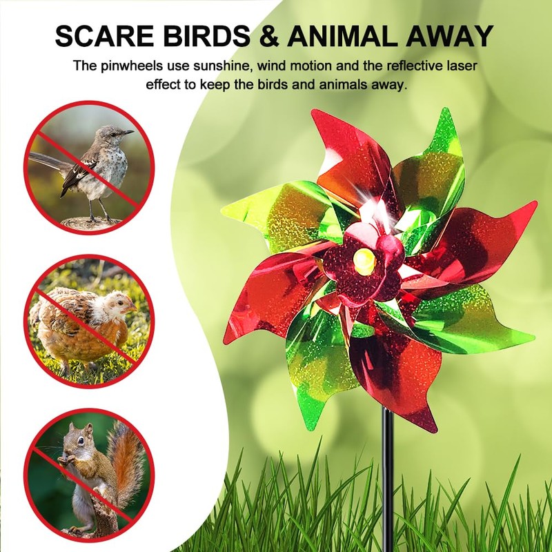 - Colorful Rainbow Reflective Pinwheels:Our visual reflective ornamental pinwheel uses wind motion and light reflections to keep birds away coming from any angle. 10 pack shiny reflective pinwheels can rotate easily in the breeze, protect your garden, farm, and lawn by creating a bright flash that scares away birds