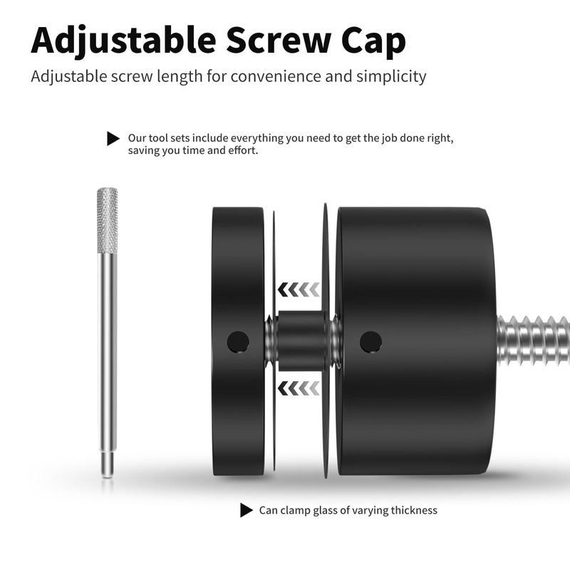 - Adjustable Standoff Screws: Diameter: 2 inch/50mm, Cap Height: 0.39 inch/10mm. The adjustable design allows the post screws to be adapted to different thicknesses of glass or other materials, providing greater installation flexibility.