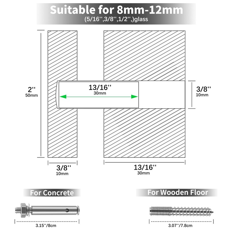 - Wide Application: Suitable for 8mm-12mm (5/16", 3/8", 1/2") thick glass, with a recommended hole size of 10mm in diameter.