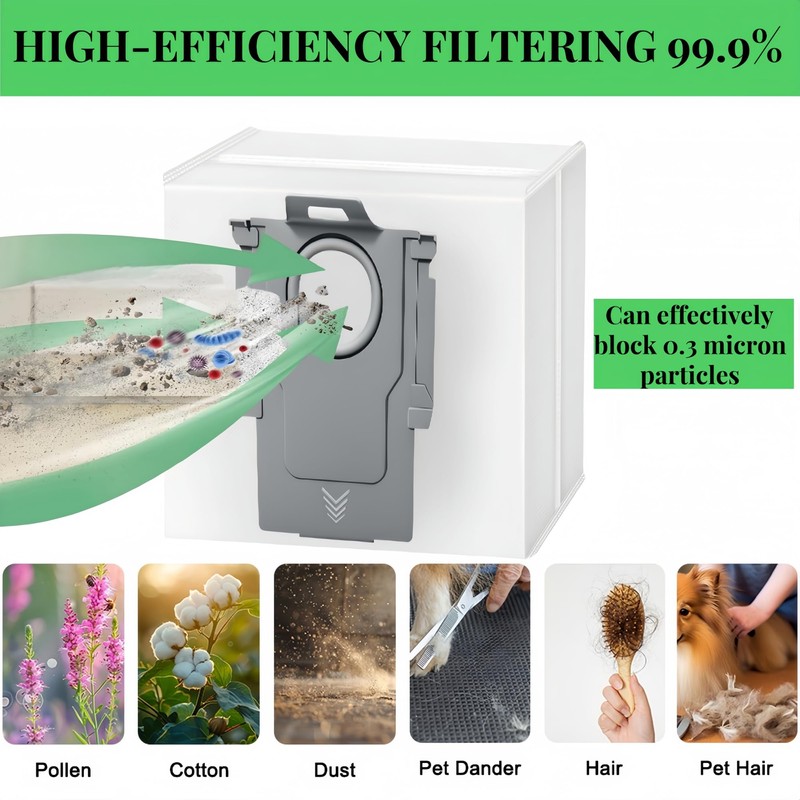 - Efficient Filtration: S7、S8 sweeping robot dust bag are made of premium 2-layer superfine melt-blown fiber filter and 2-layer non-woven fabrics. Lock 99.9% of dirt, hair and other particles down to 0.3 microns, 3L replacement dust bag can hold more dust、debris