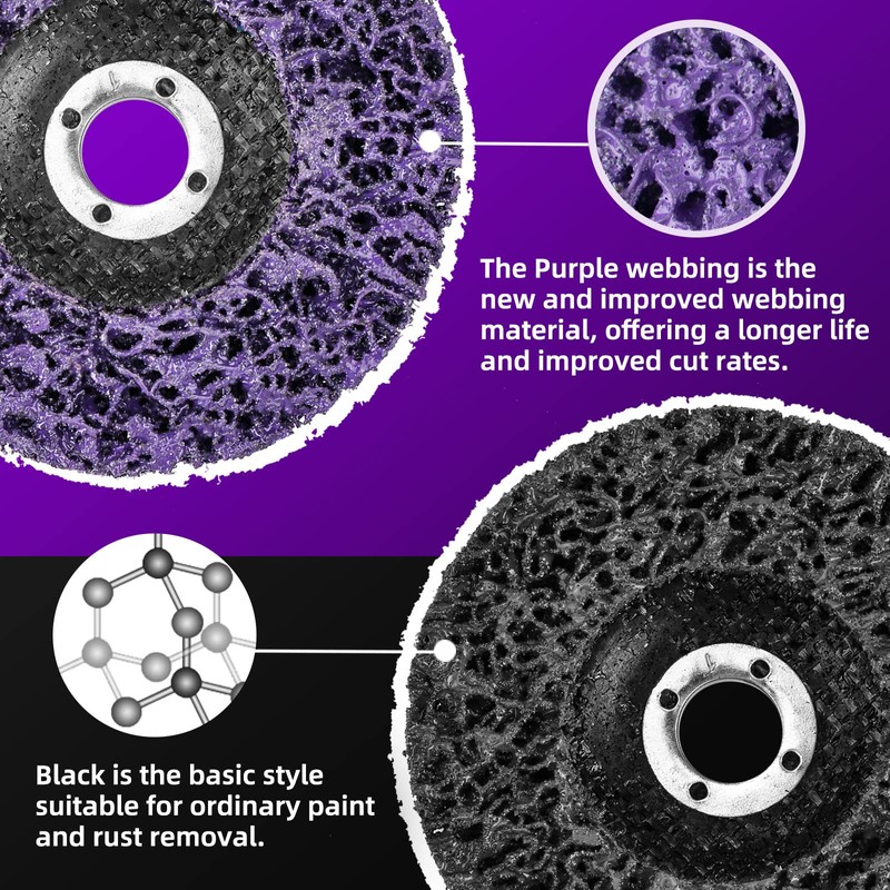 - 【Difference Between Colors】-The black discs are great for ordinary paint and rust removal, while the purple discs are made from an improved webbing material, offering longer life and improved cut rates compared to the black discs.