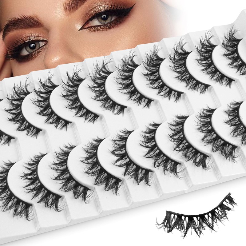 10 Pairs Wispy Lashes Wet Natural Look D Curl False Eyelashes Fluffy Cat Eye Lashes 3D Volume Fake Eyelash Pack Faux Mink Lashes Extension Party Halloween Cosplay Makeup