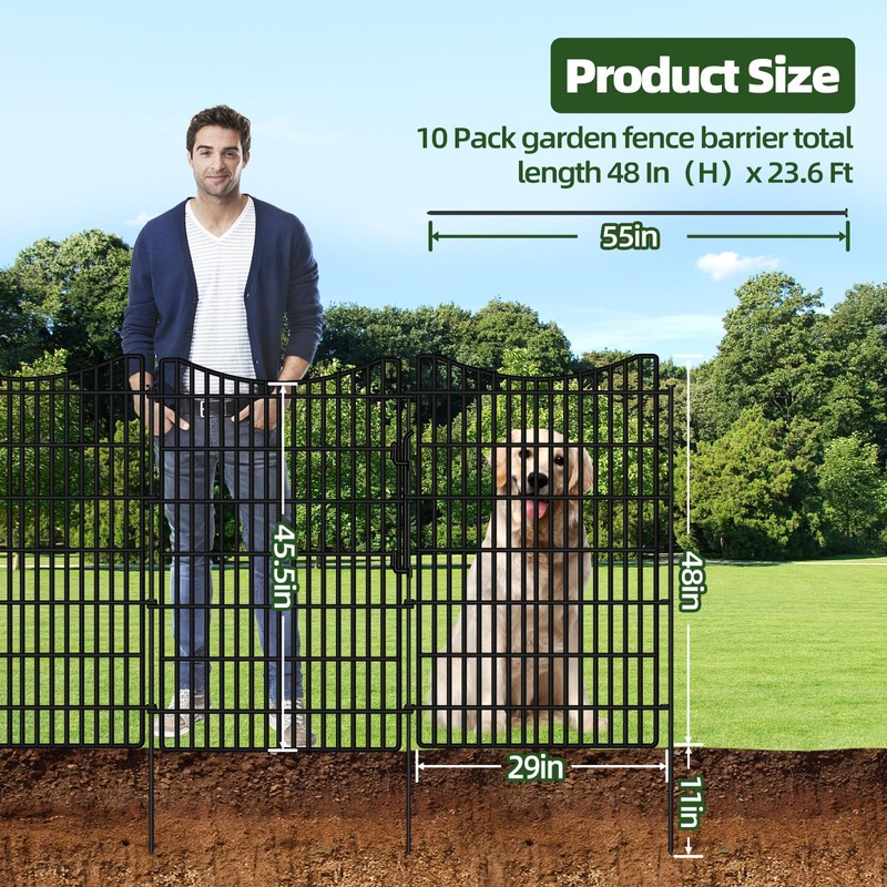 - 【Dog Fence Outdoor for Yard】Each panel measures 48" H x 29" W with a 1.6 inch gap, and a set of 10 panels connects to 23.6 feet in length, these tall garden fences provide superior protection for your yard, patio, or garden. The sturdy metal construction ensures durability, while the concavity design adds a decorative touch to your outdoor space.