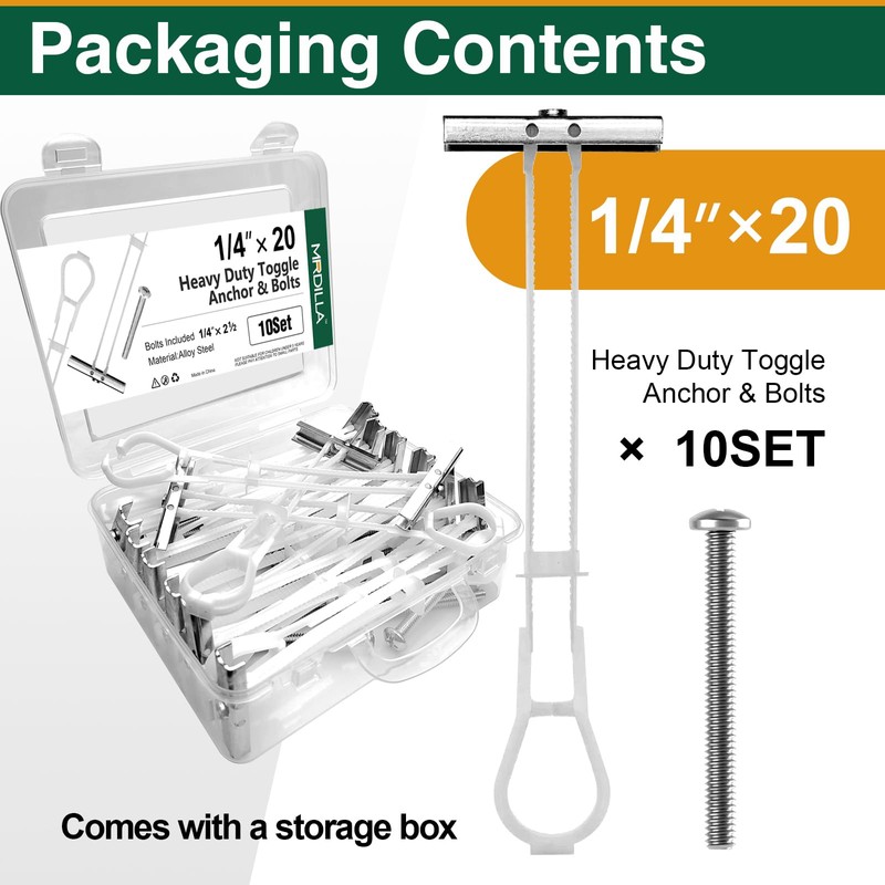 10 Pcs 1/4-20 Metal Drywall Anchors Set, Heavy Duty Toggle Bolts Holds 260lbs for TV Wall Mounting & Shelves