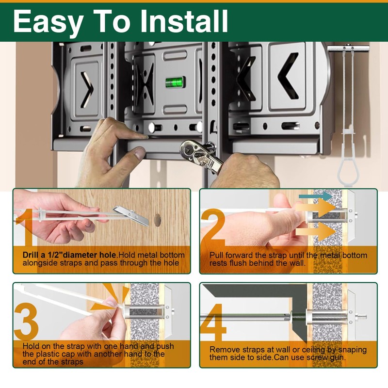 - Quick,No-Twist Installation: Drill a 1/2″ hole (with at least 1-7/8″ clearance behind the wall), slide in the metal channel, pull the straps to lock it in place, and drive in the bolts. A fast, secure, one-person job—just a screw gun needed