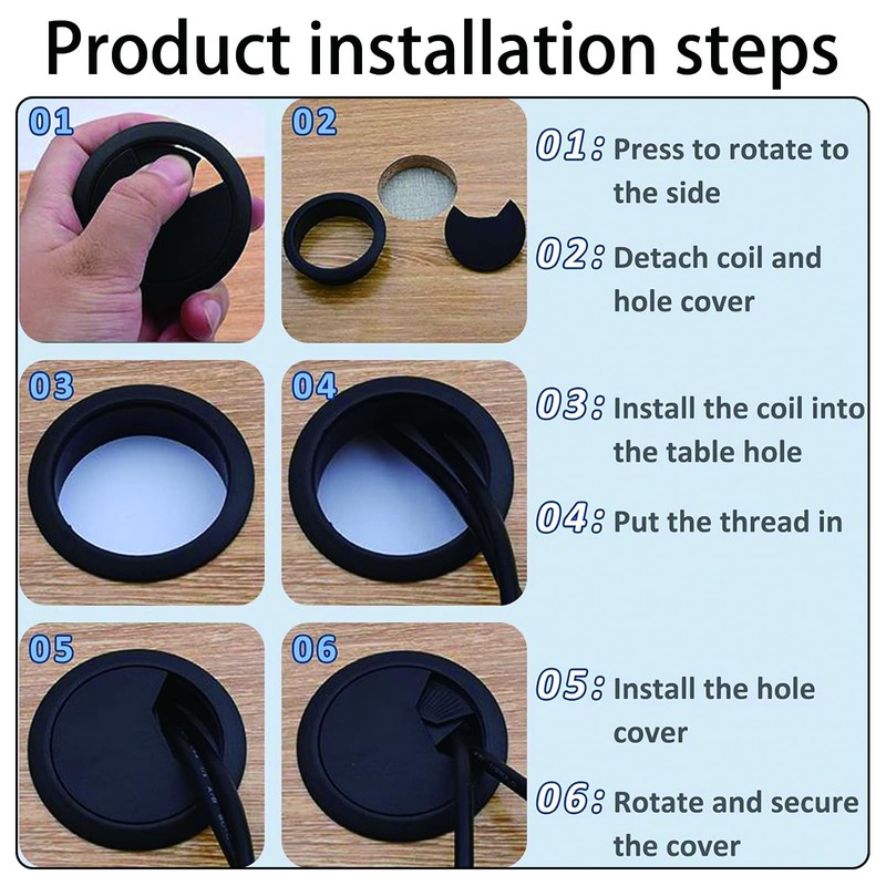 Easy to Install: You can easily install the cable hole cover on your desk, the cover is removable and has a small opening, you can adjust the size of the opening by spring to get the right hole.