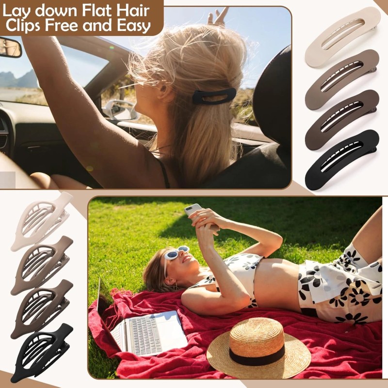 2. [Product Features and Styling Options:] The hair clips feature 3 styles, easy-to-use gels, a solid, non-slip design, smooth surface for dry hair, versatility for daily wear or beach/party occasions, compatibility with multiple users, flat design without tugging, and seamless application in driving or lying down while taking a bath.