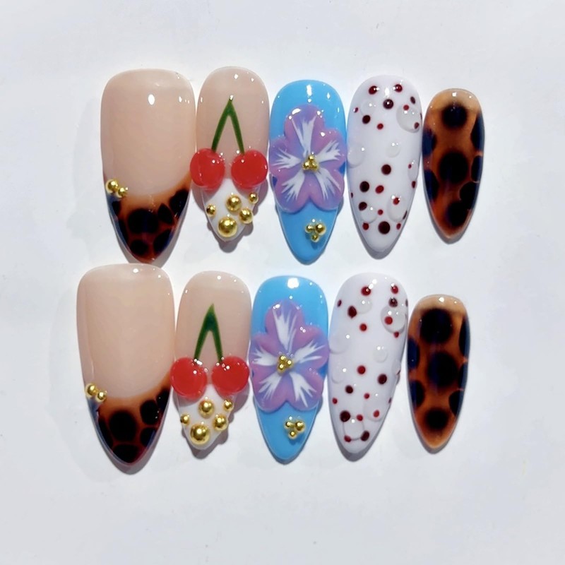 10 Pcs Handmade French Tip Press on Nails Medium Almond Fake Nails with with 3D Cherry Flower Design Fall Leopard False Nails Handmade Acrylic Nails Press ons Reusable Stick on Nail for Women (S)