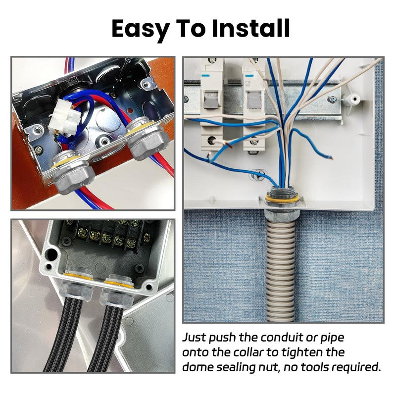 - Easy to Use: These conduit connectors can be easily attached to junction boxes and securely fastened to flexible conduits without additional tools. Simply push the pipe or tubing into the fitting and tighten the dome seal nut for quick and hassle-free operation.