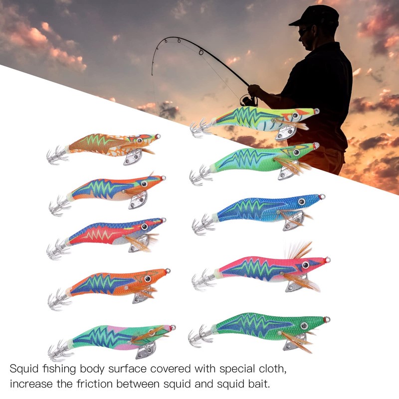 【Lifelike fishing bait】This fishing bait has lifelike 3D eyes, feather wing design and bright colors that can effectively attract squid's attention and help you improve fishing efficiency.
