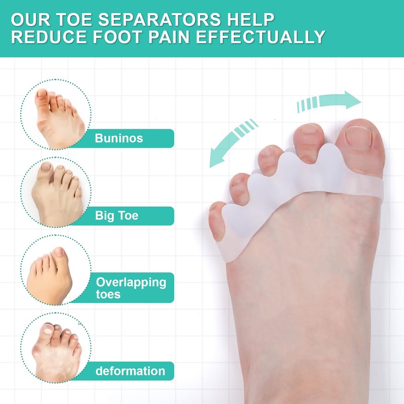 2. Soft and Comfortable: Our toe spacers are made from medical grade silicone. Easy to clean, durable and guaranteed to last! Soft silicone, stretchy, washable, reusable and durable.