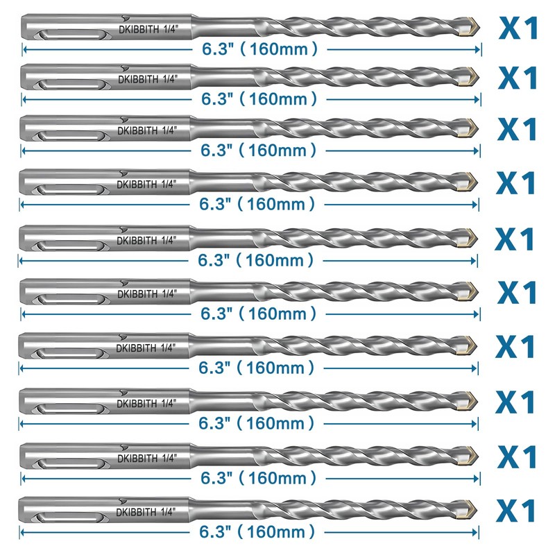 • High Volume 10-Piece Set: This SDS Plus Drill Bits set includes 10 pieces of the most popular size 1/4" drill bits (6 1/3” long), providing ample quantity to handle multiple projects or extensive drilling needs. Perfect for your DIY projects or professional construction work.