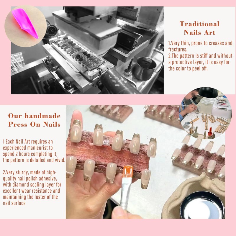 - - Reusable : Our wear nails are handmade, delicate and Very sturdy, our press on nails are reusable, allowing you to enjoy multiple wears. Say goodbye to frequent salon visits and hello to long-lasting nails.