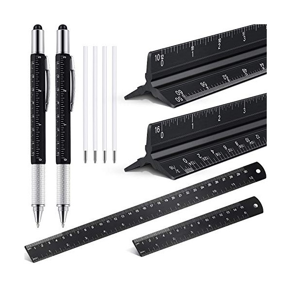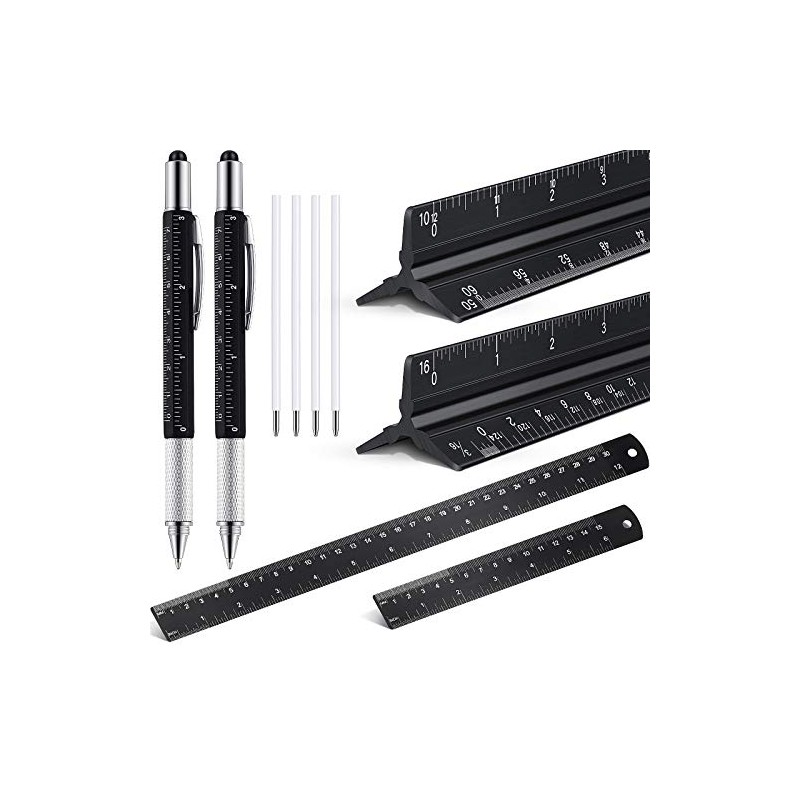 - What you will get: package includes 1 piece black architect scale ruler, 1 piece triangular engineering ruler, 2 pieces black standard sturdy steel ruler in 2 different sizes, such as 12 inch/ 300 mm and 6 inch/ 150 mm, 2 pieces 6 in1 multifunctional pen and 4 pieces black ink refills; Nice combination for satisfy your needs