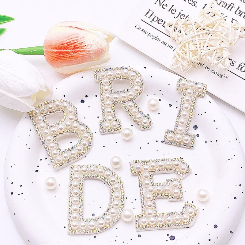 - ELEGANT BRIDE LETTER PATCHES This set is made of iron-on rhinestones with sparkling faux pearls in white and pink (5.5 x 3.4 cm). The sparkly diamond bead letter patches create stunning bridal embellishments for DIY wedding projects.